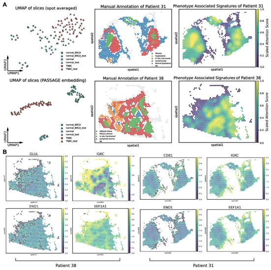 图2 A) PASSAGE在乳腺癌案例中成功学习到良好的切片级表征与所识别的表型关联空间特征B) PASSAGE在乳腺癌案例中成功学习到与表型关联空间特征高度关联的基因集