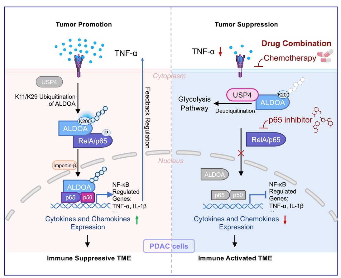 图.泛素化修饰介导的ALDOA-p65信号轴促进胰腺导管腺癌(PDAC)发生的机制
