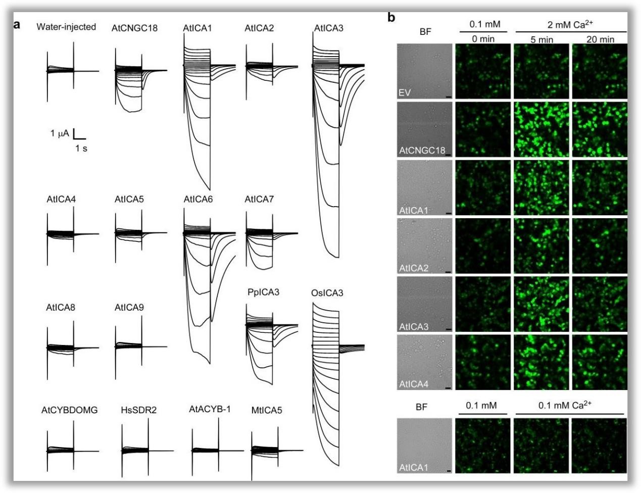 2026年1月5日,基因功能研究与操控全国重点实验室、北京大学现代农学院田望研究员课题组与合作者在国际植物学权威期刊 Nature Plants 发表题为“Arabidopsis IONIC CURRENT FAMILY A proteins facilitate environmental calcium acquisition essential for stress tolerance”的研究论文(DOI:10.1038/s41477-025-02179-3)。研究团队通过生物信息学分析与电生理实验相结合的策略,鉴定出一类植物特有的蛋白家族。电生理实验表明,该类蛋白在非洲爪蟾卵母细胞中表达时,能激发显著的Ca2+通透性非选择性阳离子电流。基于这一特征,研究人员将其命名为“离子电流家族A”(Ionic Current Family A,简称 ICAs)(图1)。