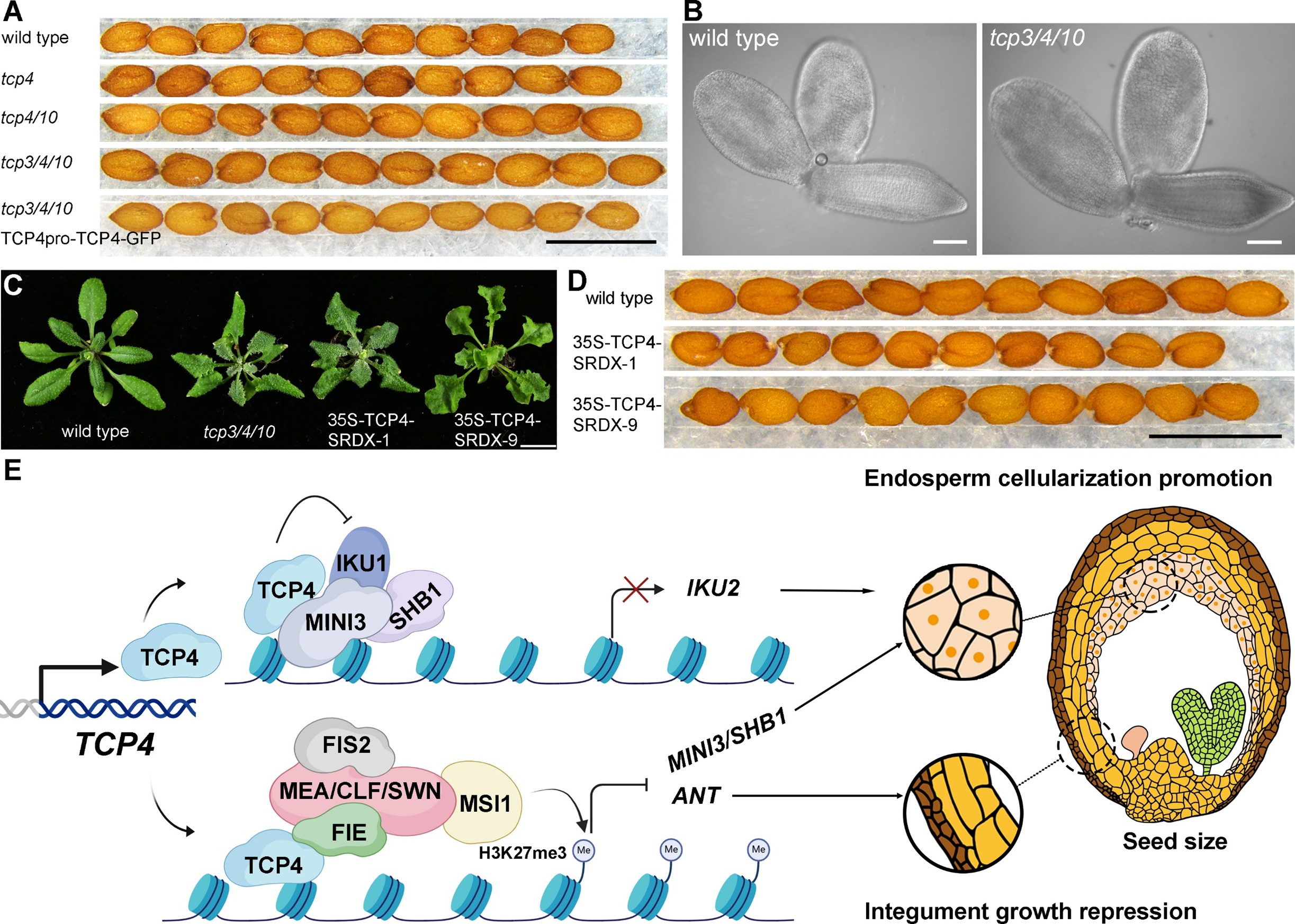 TCP转录因子家族得名于玉米TB1、金鱼草CYC和水稻PCF三类基因的首字母缩写,在植物发育中发挥核心调控作用。秦跟基教授团队长期致力于TCP家族的功能解析。前期工作中,该课题组通过遗传杂交与CRISPR技术创制了tcp七重和十二重突变体,系统揭示了TCP转录因子在表皮毛发育(Lan et al., Plant Physiol, 2021)、花瓣颜色(Zheng et al., Plant Commun, 2022)、雌蕊顶端命运决定(Wang et al., Plant Cell, 2024)、水稻花药开裂(Fang et al., Plant Cell, 2024)以及高温下胚珠命运维持(Lan et al., Nature Commun, 2023)中的重要作用。在研究TCP调控胚珠发育过程中,课题组注意到其同时影响珠被生长,暗示TCP可能参与种子大小调控。为验证这一假设,研究人员首先对育性正常的三重突变体tcp3/4/10进行分析,发现其种子明显增大(图1A, B);而过量表达TCP4则导致种子变小。进一步观察表明,tcp3/4/10胚珠和外珠被面积显著大于野生型,外珠被细胞增殖过度,同时胚乳细胞化与胚胎发育均延迟。这说明TCP通过同时调控珠被/种皮发育与胚乳细胞化来影响种子大小。分子机制研究表明,调控胚乳细胞化的关键基因MINI3、SHB1、IKU2以及控制珠被生长的ANT在tcp3/4/10中表达显著上升,下游基因CKX2与YUC4也相应上调。深入研究发现,TCP4能与FIS-PRC2复合体的关键组分FIE直接互作,并将FIS-PRC2招募至MINI3、SHB1和ANT的启动子区域,通过介导H3K27me3修饰抑制这些基因的表达,从而协同调控胚乳细胞化与珠被增殖。此外,TCP4还可直接与MINI3蛋白互作,抑制MINI3-SHB1转录激活复合体的活性,进而下调IKU2表达。有趣的是,在野生型中表达融合转录抑制结构域SRDX的TCP4-SRDX,植株叶片呈现类似tcp3/4/10的卷曲表型(图1C),种子却与TCP4过表达植株类似,表现为变小(图1D)。这表明TCP4在不同组织中可能分别发挥转录激活或抑制的功能。