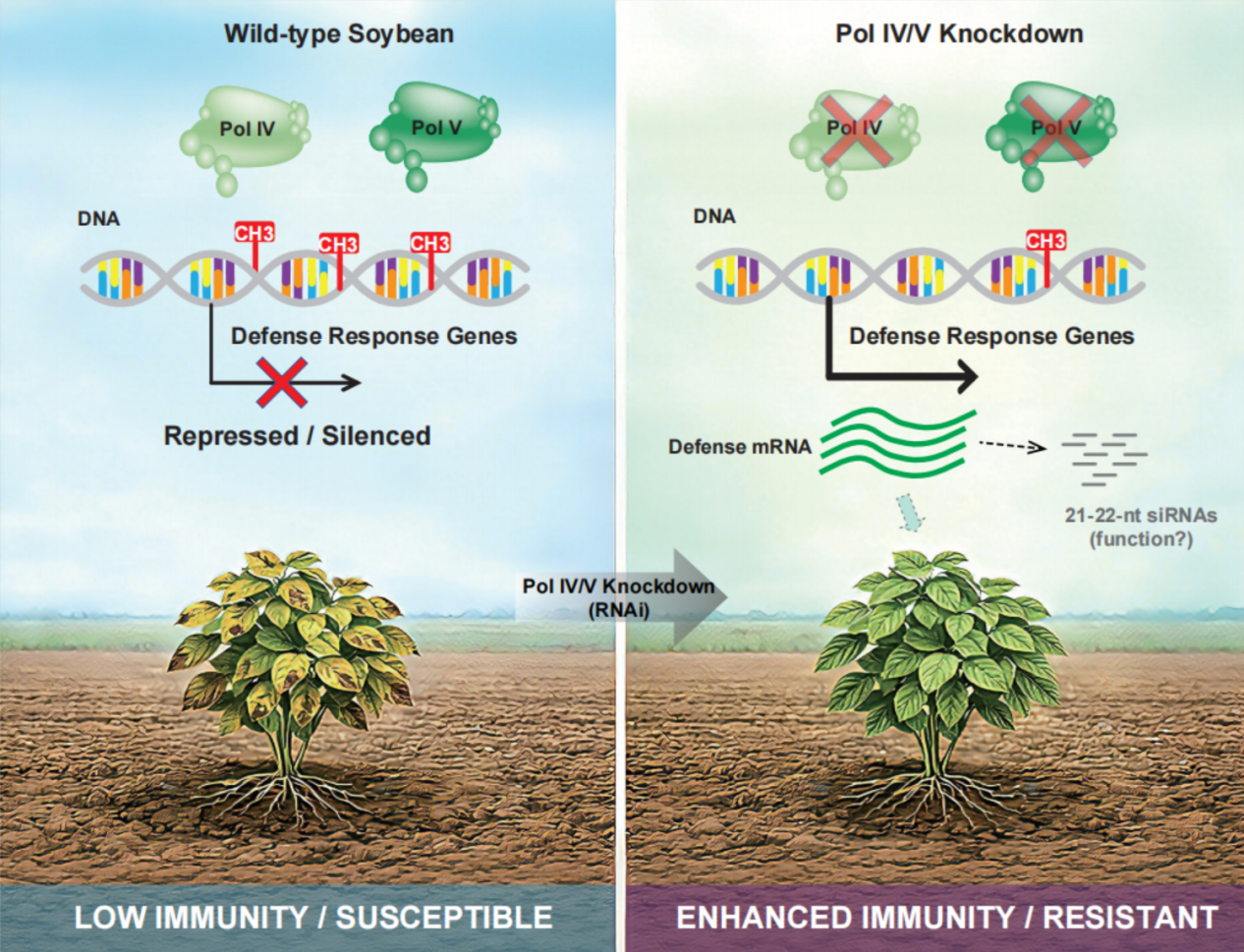 在经典模式植物拟南芥中,RdDM通路的核心机制已被系统阐明:Pol IV负责产生24-nt siRNA的前体,Pol V则通过生成“支架RNA”将siRNA引导至同源基因位点,触发DNA甲基化,从而实现对转座子和部分基因的转录沉默。然而,这一通路在农作物大豆中的分子功能与生物学意义,尤其是其与植物免疫之间的关系,仍知之甚少。