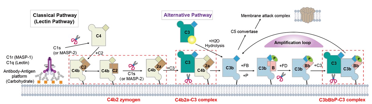 图1.补体级联通路示意图。红色标记为本研究中解析完成的复合物。