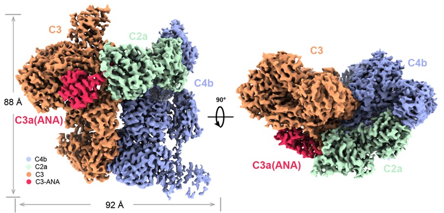 最后,研究者利用获得的高分辨结构对两种代表性的靶向补体C3环节的药物作用机制进行分析,阐明了两种药物作用的分子机制,为开发补体靶向药物提供重要信息。