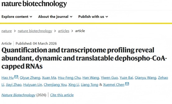 2026年3月4日,基因功能研究与操控全国重点实验室、北京大学生命科学学院院长、北京大学核糖核酸北京研究中心主任、北大-清华生命科学联合中心陈雪梅院士课题组在Nature Biotechnology发表了题为“Quantification and transcriptome profiling reveal abundant, dynamic and translatable dephospho-CoA-capped RNAs”的研究论文。该研究鉴定出特异性识别dpCoA帽修饰的脱帽酶AtNUDT11/15/22,并基于该酶建立了dpCoA-TLC定量方法和dpCoA-CapZyme-seq测序技术,并辅以dpCoA-maleimide-qPCR与APM gel-northern blotting双重验证体系,结合体内翻译报告系统,揭示了dpCoA-RNA跨物种的丰度动态变化,绘制了其全转录组图谱,并确立了其潜在的光照响应功能和可翻译属性。