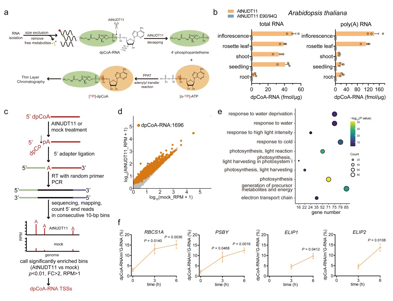 图1.拟南芥dpCoA-RNA转录组特征及其生物学功能。a, dpCoA-TLC生物酶法定量技术示意图。b, 拟南芥不同组织dpCoA-RNA含量具有明显差异。c, dpCoA-CapZyme-seq测序技术流程图。d, 拟南芥共鉴定到1696个基因产生dpCoA-RNA。e, GO富集分析表明拟南芥dpCoA-RNA主要参与光合作用等过程。f, 拟南芥dpCoA-RNA响应高光胁迫。