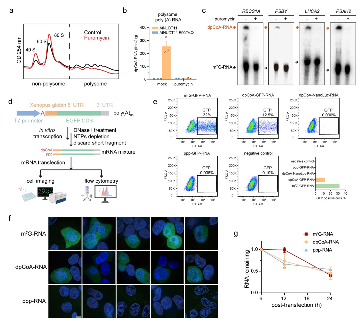 图2. dpCoA-RNA具有可翻译属性。a, 蔗糖梯度分离拟南芥多聚合核糖体。b, dpCoA-TLC检测结果表明puromycin翻译抑制剂处理后dpCoA-RNA从多聚核糖体上解离。c, APM gel-northern blotting检测表明puromycin翻译抑制剂处理后特定基因dpCoA-RNA从多聚核糖体上解离。d, 细胞内dpCoA-RNA翻译体系示意图。e,流式细胞仪显示m7G-GFP-RNA与dpCoA-GFP-RNA均能在转染细胞中表达出荧光蛋白。f, 共聚焦显微观察显示m7G-GFP-RNA与dpCoA-GFP-RNA转染细胞能表达GFP荧光。g, 转染后细胞体内各类型体外转录RNA的稳定性。