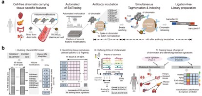 针对这一关键瓶颈,研究者构建了基于自动化平台的 cf-EpiTracing 技术体系,实现了血浆中多种组蛋白修饰标记的同步富集与多模态整合解析。该方法突破了传统检测“预设标志物”的思路限制,以多模态表观调控为中心,基于全局染色质表观调控特征对组织器官进行无偏溯源与健康状况评估。