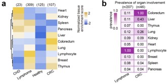 为实现真正意义上的“无偏溯源”,研究团队建立了以健康人群为参照的组织富集评分模型,对每种组织器官来源信号建立基线,从而在无需临床先验信息的情况下识别异常组织器官来源。不同疾病呈现出高度特异的组织富集模式:冠心病以心脏信号显著升高为特征,结直肠癌突出结直肠来源信号,淋巴瘤则以淋巴细胞信号为主,体现出跨疾病精准溯源能力。更具突破性的是,在部分尚无明确影像学证据的患者中,模型已提前检出潜在受累器官信号——如部分结直肠癌患者的肝脏信号升高,以及淋巴瘤患者乳腺、胰腺和脾脏等结外受累相关信号增强——且与临床实际受累分布高度一致,凸显其在早期预警和系统性评估中的敏感性与前瞻价值(图3)。