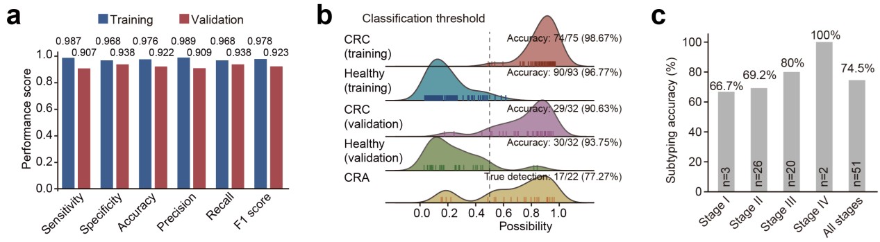 在结直肠癌早诊早筛领域,cf-EpiTracing 展现出卓越的检测性能与分型能力。通过整合游离染色质上多模态表观组学特征并结合机器学习算法,cf-EpiTracing 可实现对结直肠癌与健康人群的高精度区分。基于 XGBoost 构建的模型在训练队列中准确率达 97.6%,在独立验证队列中仍保持 92.2% 的稳健表现(图4)。
