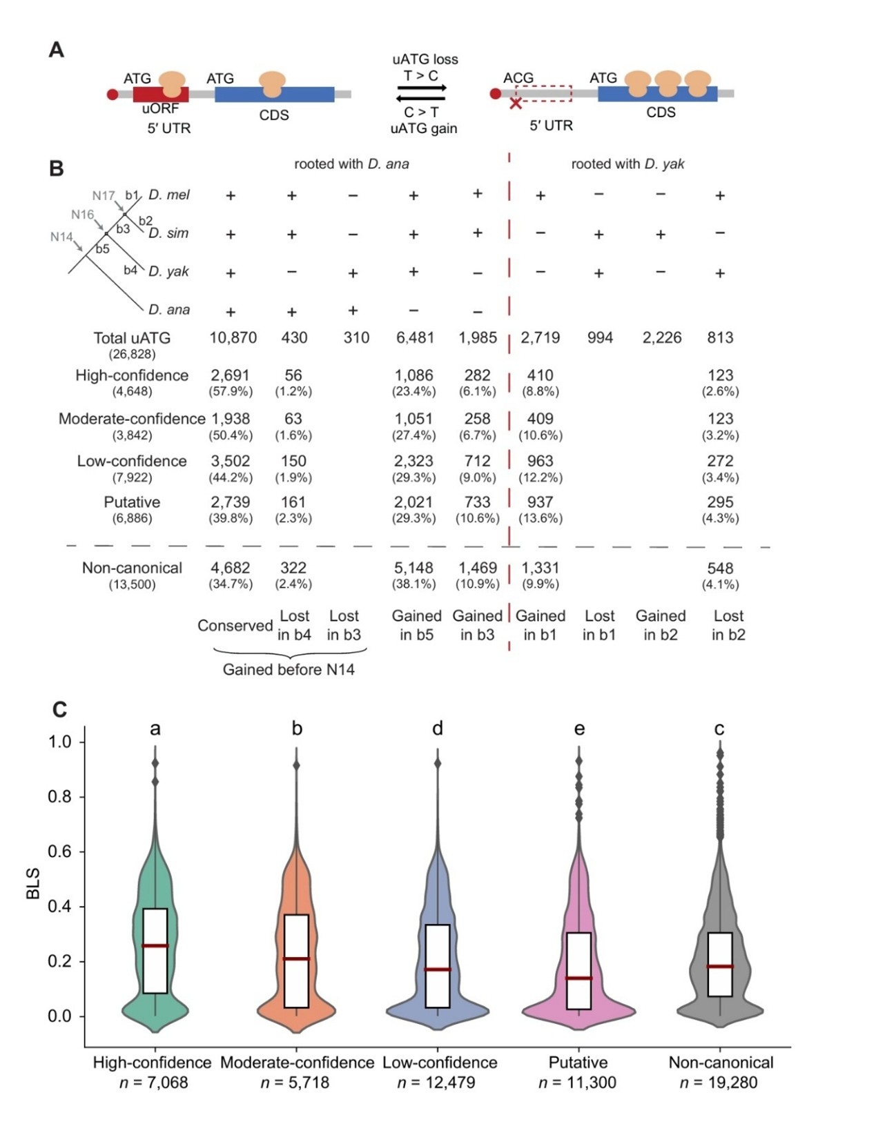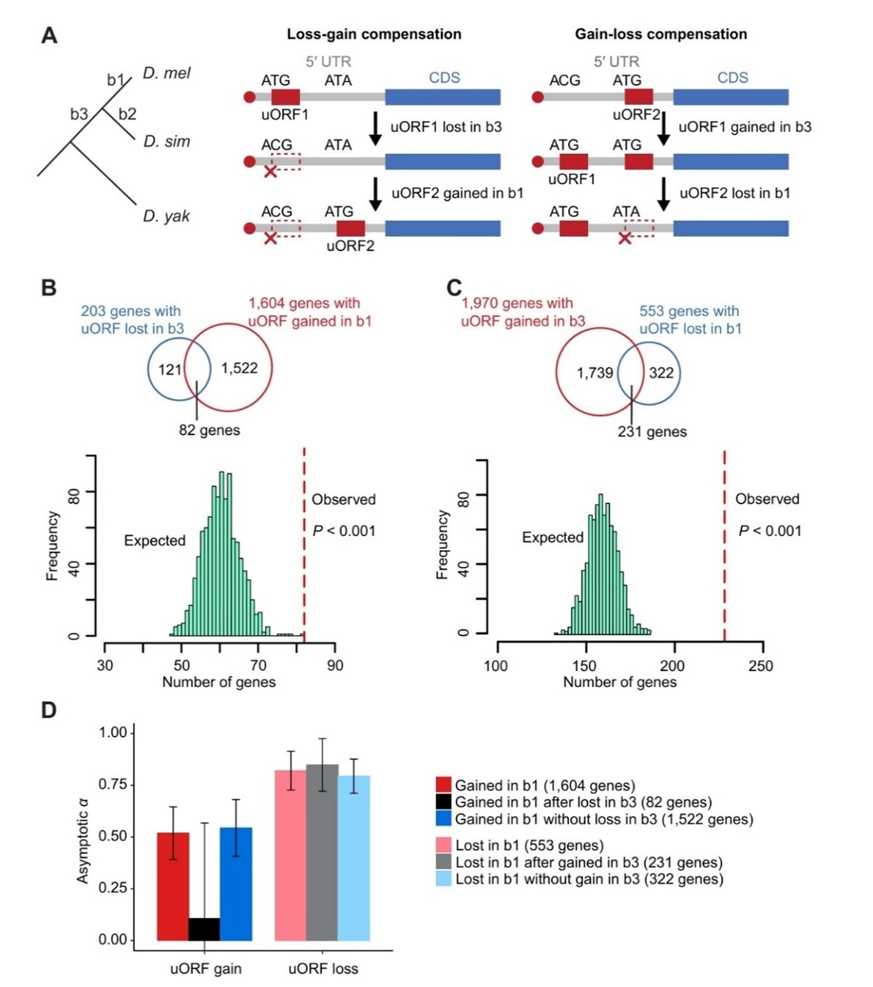 陆剑课题组揭示果蝇上游开放读码框的演化规律与补偿机制
