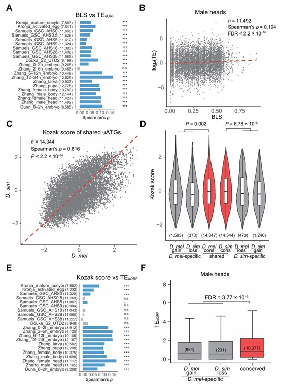 图2:保守uORF具有更高的翻译效率和优化的Kozak序列。A. 果蝇21个样本中uORF翻译效率(TE)与分支长度得分(BLS)的相关性分析;B. 雄性头部样本中uORF TE与BLS的相关性散点图;C.D. melanogasterD. simulans间直系同源uATG的Kozak得分相关性分析;D. 保守uORF与物种特异性uORF在D. melanogasterD. simulans中的Kozak得分比较,保守uORF显著更高;E. 果蝇21个样本中uORF TE与Kozak得分的相关性分析;F. 雄性头部样本中保守uORF与物种特异性uORF的TE比较,保守uORF翻译效率显著更高。