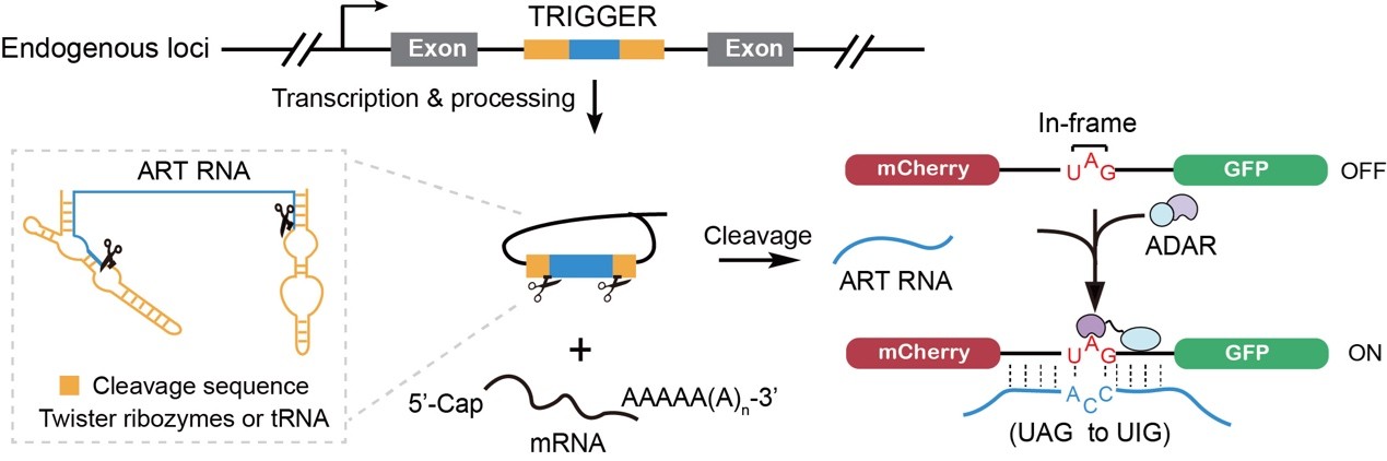 针对上述挑战,汪阳明团队创新性地开发了REDDIT系统,将内源转录事件转化为可检测的蛋白输出信号。该系统的核心设计是在报告基因中引入一个终止密码子(UAG),以阻断下游荧光蛋白的翻译;同时,将一段长度仅为281 nt的TRIGGER序列整合至目标基因的转录区域。当目标基因发生转录时,产生的TRIGGER序列经自剪切核酶加工后释放,并通过碱基配对招募内源RNA编辑酶ADAR,在报告转录本的特定位点发生A-to-I编辑(UAG-to-UIG),从而激活下游GFP的翻译(图1)。