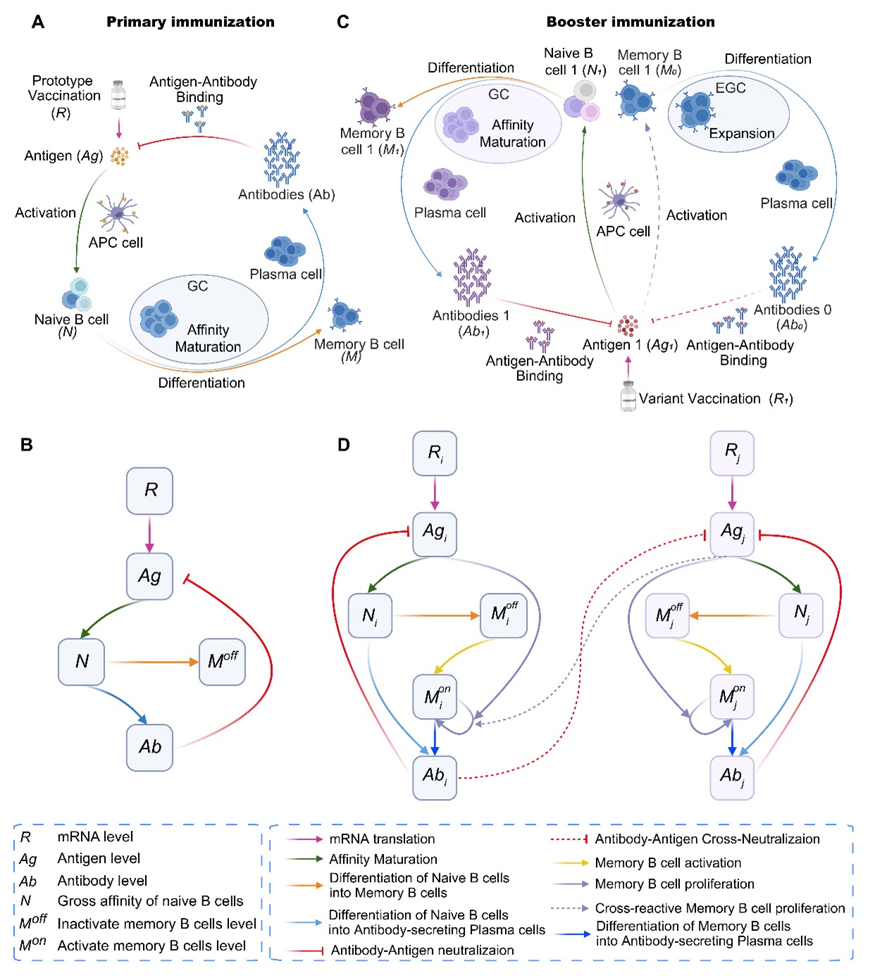 图1:DynaVac模型构建与免疫应答动力学框架。A. 初次免疫过程中,mRNA来源抗原诱导初始B细胞活化、亲和力成熟、记忆B细胞形成及抗体产生的示意图;B. 初次免疫阶段关键免疫变量之间的抽象动力学关系;C. 异源加强免疫时,既有记忆B细胞与新激活的初始B细胞共同参与应答的示意图;D. 多变异抗原条件下交叉中和与交叉记忆激活的整体建模框架。
