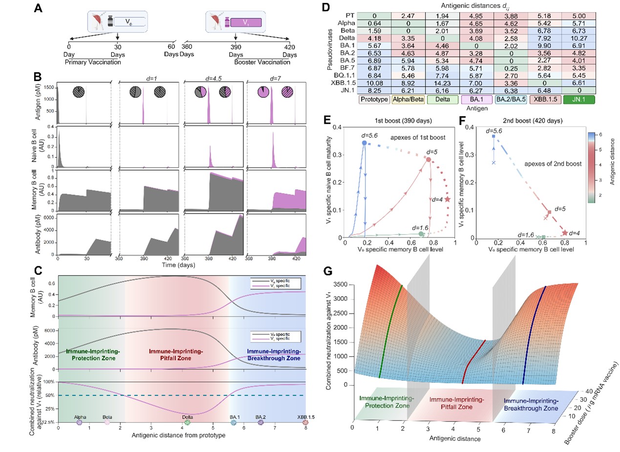 图3:抗原距离决定免疫印记的“保护区—陷阱区—突破区”。A. 模拟的接种流程:两剂原始株疫苗后,再进行两剂变异株加强;B. 在不同抗原距离条件下,抗原、初始B细胞、记忆B细胞与抗体的动态变化;C. 变异株中和能力随抗原距离变化呈U形分布,据此划分保护区、陷阱区和突破区;D. 主要SARS-CoV-2变异株与原始株之间的实验抗原距离及其在三类分区中的对应位置;E. 第一次加强免疫过程中,变异株特异性初始B细胞与原始株特异性记忆B细胞之间的竞争轨迹,展示不同免疫印记分区内早期应答主导群体的变化;F. 第二次加强免疫过程中,变异株特异性记忆B细胞与原始株特异性记忆B细胞之间的竞争轨迹,反映免疫特异性在连续加强后的重塑方向。G. 加强剂量与抗原距离共同塑造对变异株中和能力的变化趋势。