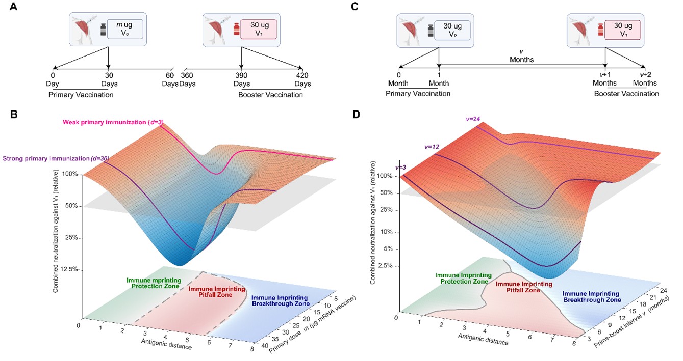图4:初免剂量和接种间隔共同塑造免疫印记效应。A-B. 初免剂量与抗原距离共同塑造加强接种对变异株中和能力,并影响免疫印记保护区、陷阱区和突破区的分布范围。C-D. 初免—加强间隔与抗原距离共同塑造加强接种对变异株中和能力,并影响免疫印记保护区、陷阱区和突破区的分布范围。