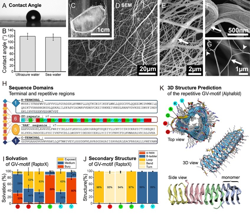 在蛛丝功能创新方面,研究取得了一些有意思的发现。家祥潮蛛的Sp蛛丝蛋白含有一种独特的GVGAKV重复基序,占序列总长的23%以上,而该基序在淡水水蛛中完全缺失。接触角测量证实,其丝巢对纯水和海水均呈现强疏水性(接触角约119°和116°)。AlphaFold结构预测显示,GVGAKV富集区域形成类淀粉样结构,暴露疏水性残基,有助于在分子层面增强蛛丝的水下功能。丝巢的微米级纤维网格(间隙小于2微米)进一步通过Cassie-Baxter效应稳定捕获空气层,使蜘蛛在高潮淹没时能维持呼吸。值得注意的是,这种蛛丝的疏水性更接近陆生蜘蛛的卵囊而非捕食网,提示家祥潮蛛可能通过蛋白基序创新,演化出了“卵囊级”的丝巢防水能力。