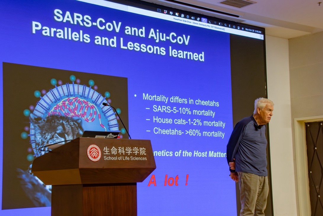 2025年10月20日下午,应基因功能研究与操控全国重点实验室、生命科学联合中心以及生命科学学院的邀请,美国国家科学院院士、著名遗传学家Stephen J. O’Brien教授访问我校,并在北京大学生命科学学院邓祐才报告厅作题为“Plagues in Our Times: Lessons from Disease Outbreaks in Nature”的学术报告。报告由基因功能研究与操控全国重点实验室成员罗述金教授主持。