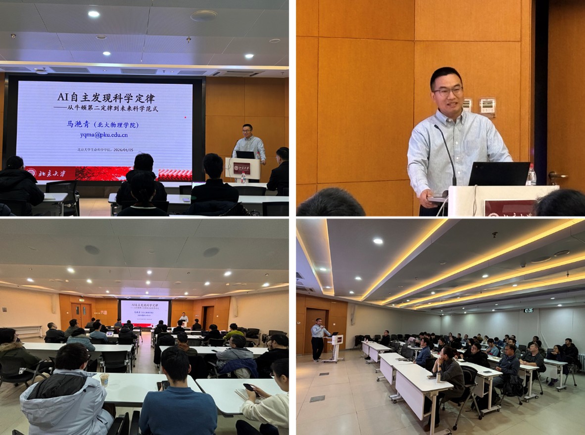 2026年1月5日上午,北京大学物理学院博雅特聘教授马滟青应基因功能研究与操控全国重点实验室院贺新强教授邀请来到生命科学学院,并在吕志和楼B101报告厅作题为“AI自主发现科学定律——从牛顿第二定律到未来科学范式”的精彩学术报告。报告由贺新强教授主持,吸引了众多师生参与。